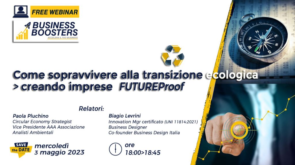 In questo primo BUSINESS BOOSTERS Webinar Paola PLUCHINO insieme con Biagio LEVRINI ci hanno parlato di Sprint Circolare: il metodo potente di Business Design per far evolvere la tua azienda dalla tradizionale economia lineare (estrai/produci/consuma/getta) ad economia circolare, così da renderla a “prova di futuro”.